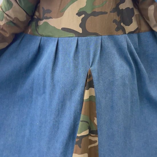 The Urban Duchess masterfully blends rugged camo patterns with the refined elegance of denim, creating a striking statement piece that commands attention from every perspective. Its design highlights voluminous puff sleeves and sharply structured pleats, expertly tailored to sculpt a sweeping silhouette that gracefully moves with the wearer. Crafted from contrasting fabrics, this gown balances toughness with sophistication, making it a standout choice for those who dare to defy convention. Ideal for fashion-forward events, it epitomizes avant-garde style and craftsmanship, perfect for individuals seeking a bold yet polished look.