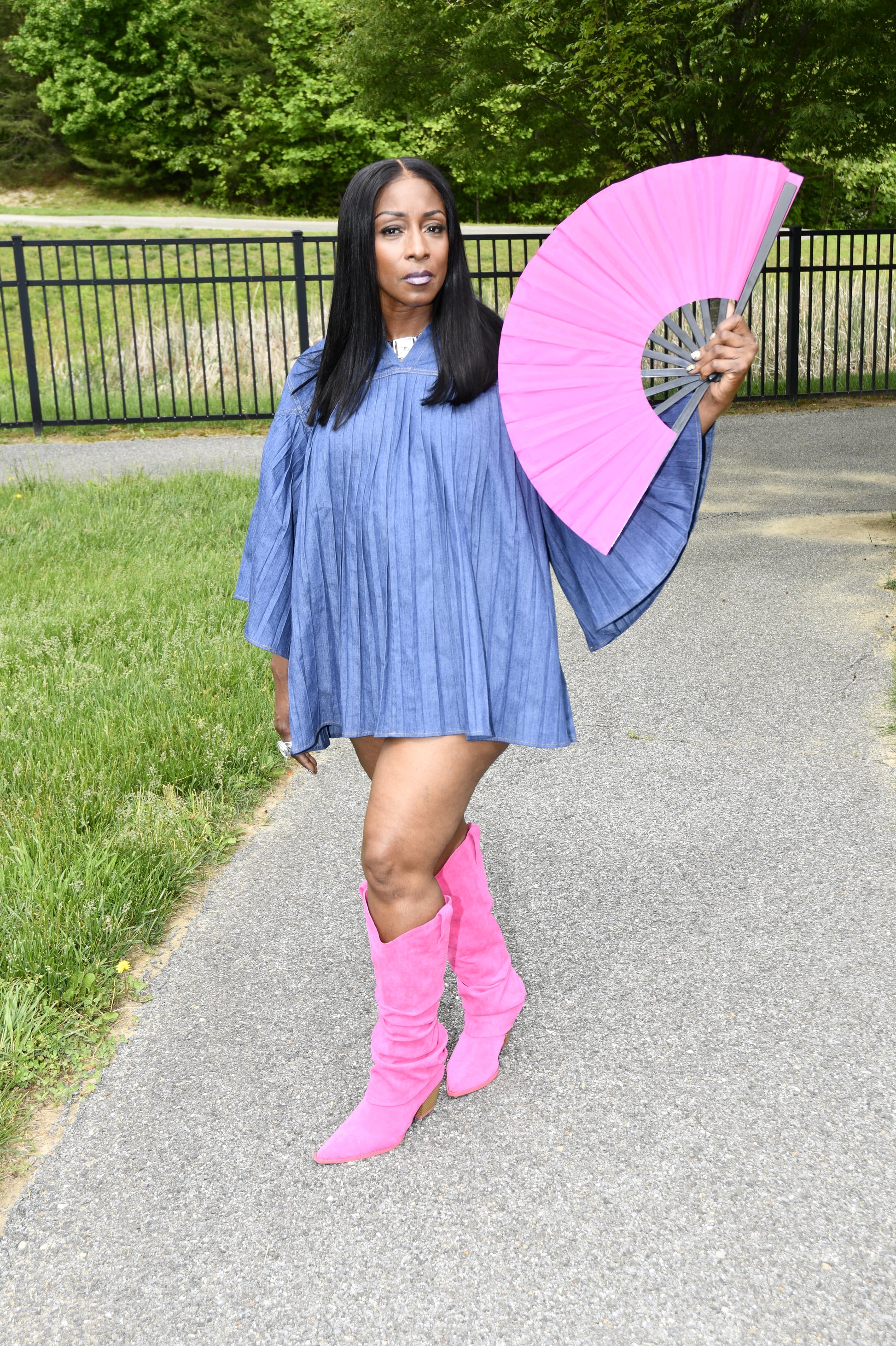 Make a bold statement in the Indigo Breeze Pleat Dress — a playful, boho-inspired piece that combines effortless style with vibrant flair. Crafted from a soft, pleated denim-like fabric, this oversized tunic features dramatic bell sleeves and a flowing, A-line silhouette for an airy, carefree vibe. The rich indigo hue is perfect for casual outings or festival-ready looks, while the striking pink boots add a fun pop of color to elevate the ensemble. Pair with statement accessories or bold footwear to complete this standout look. Model is wearing medium.