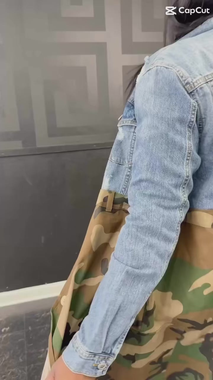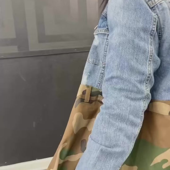 An artistic blend of street edge and sophistication, this reworked camo-and-denim longline coat is a wearable masterpiece. Featuring a cropped denim top with an oversized bow accent and camouflage body detailed with denim pockets and designer trim. A true collector’s piece. Denim bow can be removed, worn with or without bow, or can be placed anywhere on the coat.